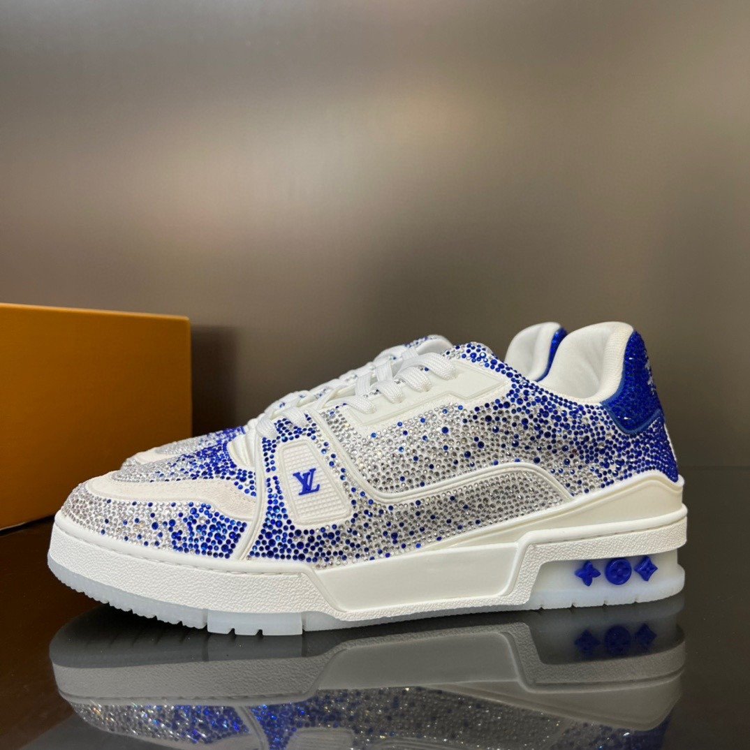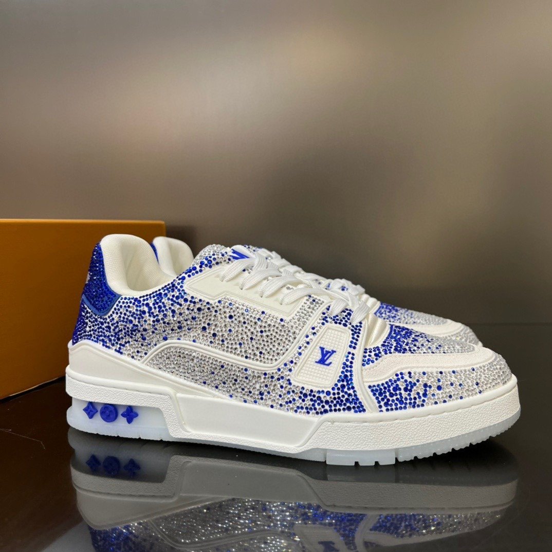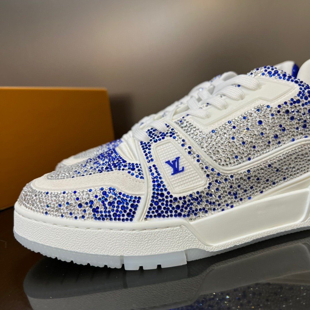 Esta versão excepcional do tênis LV Trainer é coberta de cristais Swarovski™. Um ícone da coleção de sapatos da Louis Vuitton, esse modelo foi desenhado originalmente por Virgil Abloh, que se inspirou nos tênis de basquete vintage. O design é complementado por detalhes emborrachados, incluindo LV Initials e a assinatura Vuitton na lateral.